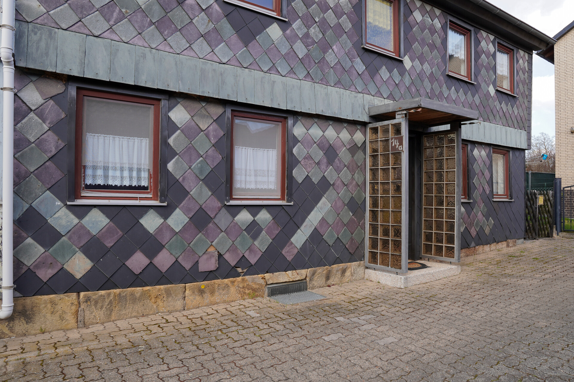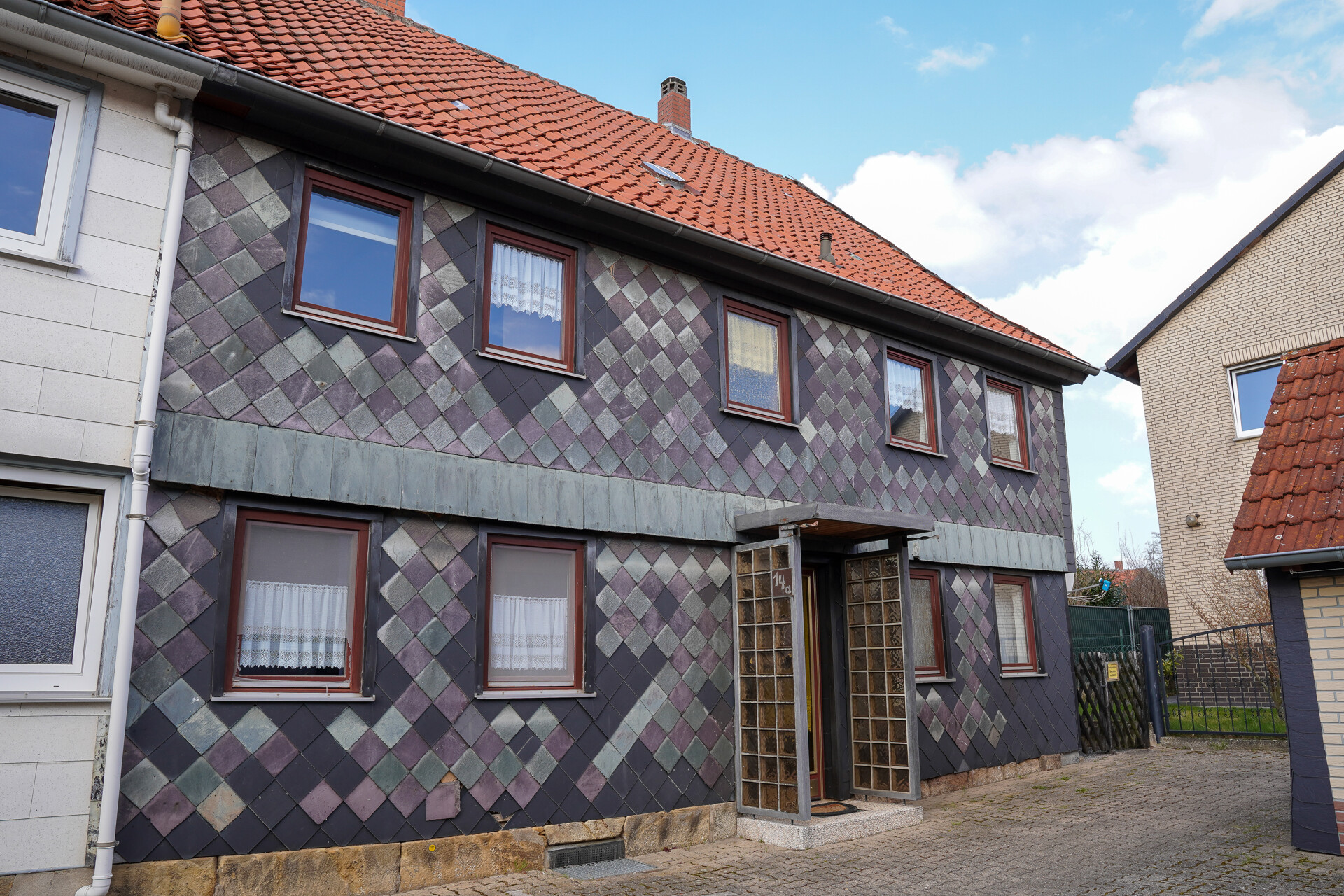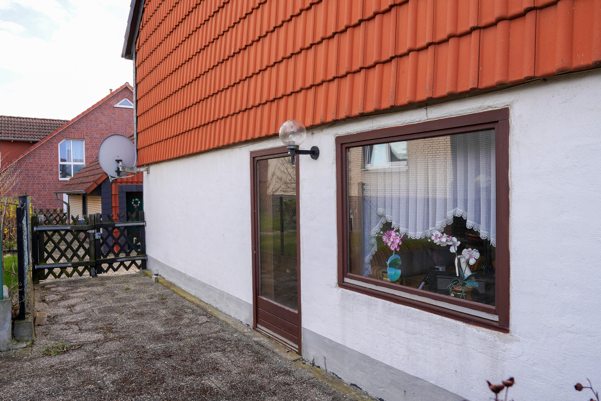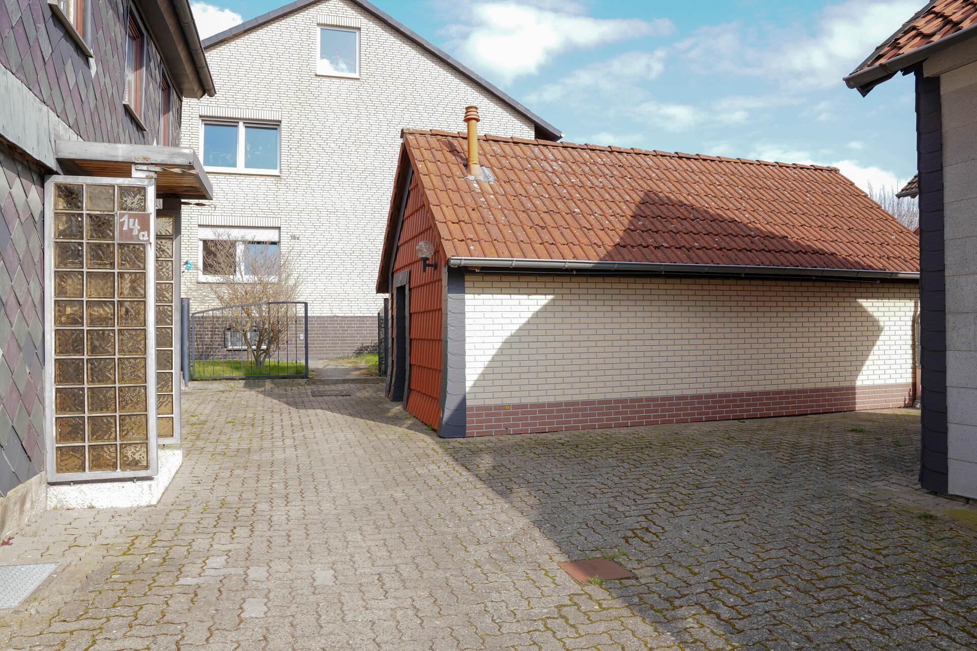 Schon beim Betreten des Grundstücks spüren Sie die klare Aufteilung und die Möglichkeiten. Der gepflasterte Außenbereich dient sowohl als Stellplatz als auch als einladender Übergang zum Wohnbereich.
