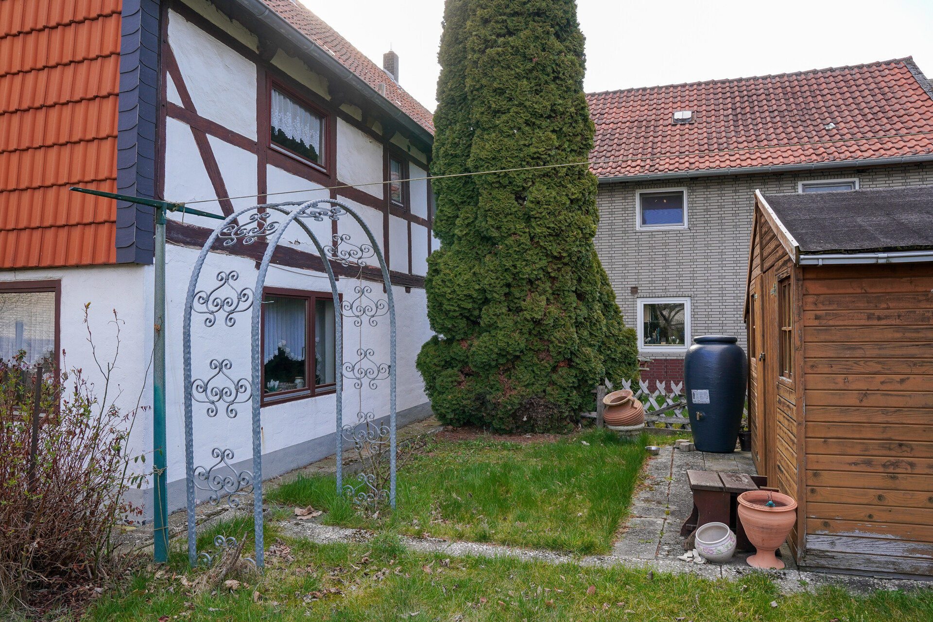 Der Garten selbst bietet vielfältige Nutzungsmöglichkeiten. Ob als Spielbereich für Kinder, als Ort der Erholung oder für gemeinsame Zeit im Freien, hier findet jeder seinen Platz. Ergänzt wird dieser Bereich durch ein Gartenhaus sowie zwei Wassertanks zur Regenwassernutzung.