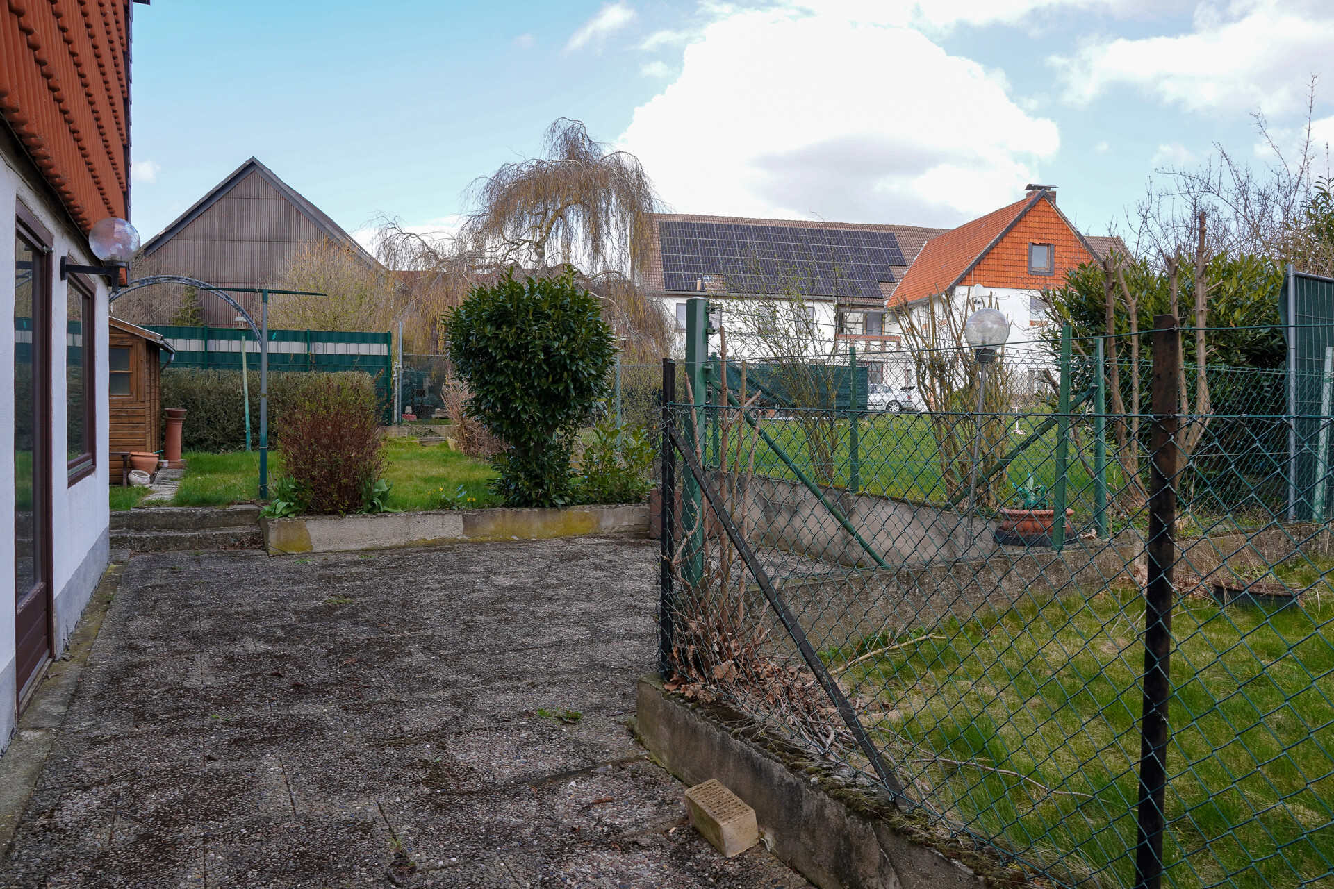 Vom Wohnbereich gelangen Sie direkt in den Garten. Eine gepflasterte Fläche bietet sich ideal als Terrasse an und schafft eine angenehme Verbindung zwischen Innen und Außen.