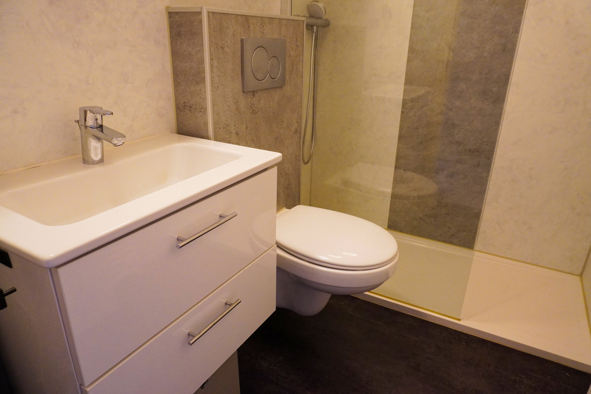 Das Badezimmer wurde vollständig modernisiert und mit hochwertigen Sanitärobjekten ausgestattet. Eine bodengleiche Dusche mit Echtglasabtrennung, ein moderner Waschtisch mit Spiegelschrank sowie stilvolle Fliesen sorgen für eine klare, zeitlose Optik. Für zusätzlichen Komfort wurde im Bad eine Fußbodenheizung installiert.