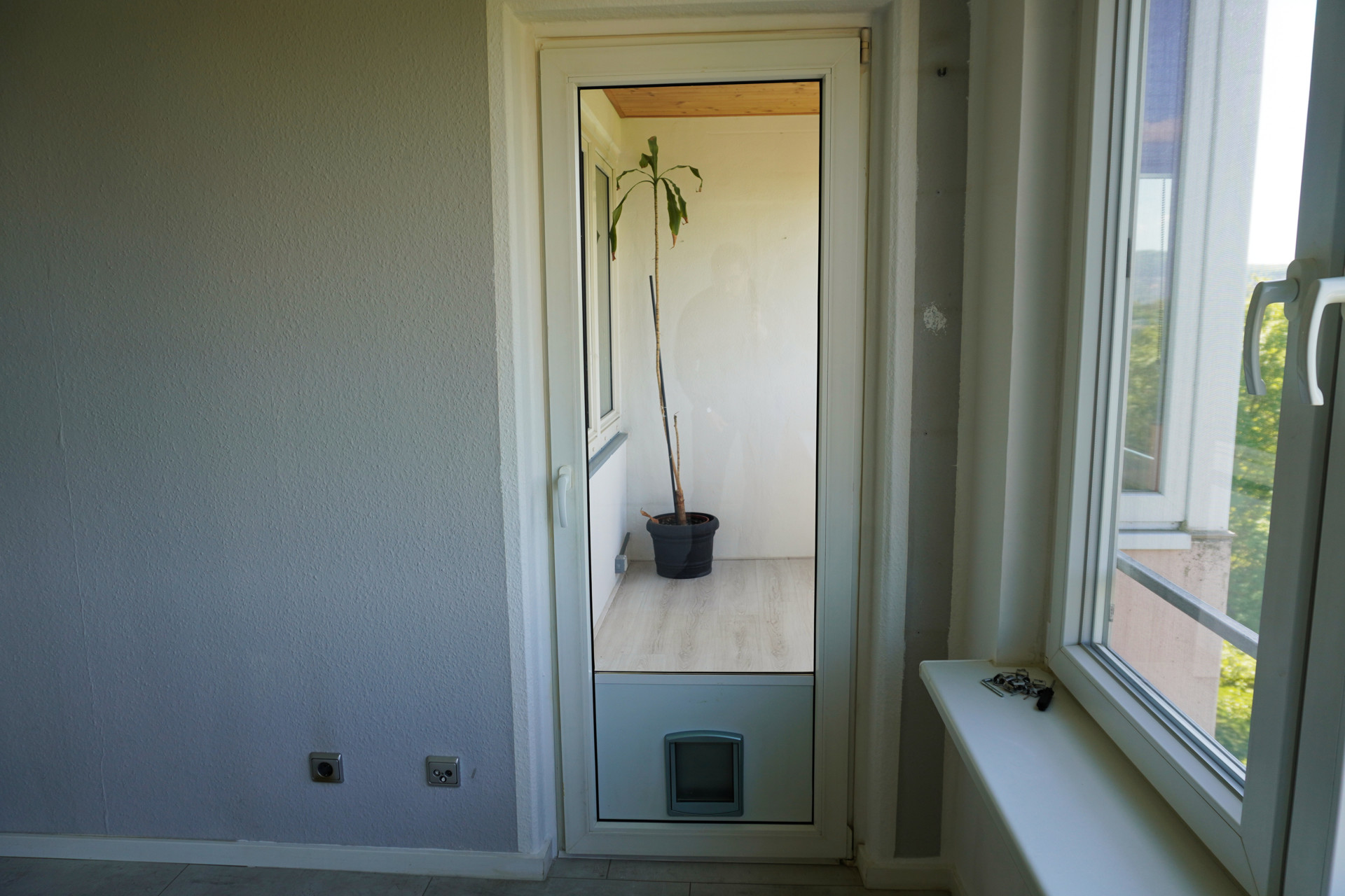 Die Wohnung verfügt über eine neue Wohnungseingangstür mit 3-fach-Sicherheitsverriegelung. Der Zugang zum Balkon erfolgt über eine moderne Glastür mit Katzenklappe – ideal für Tierfreunde.