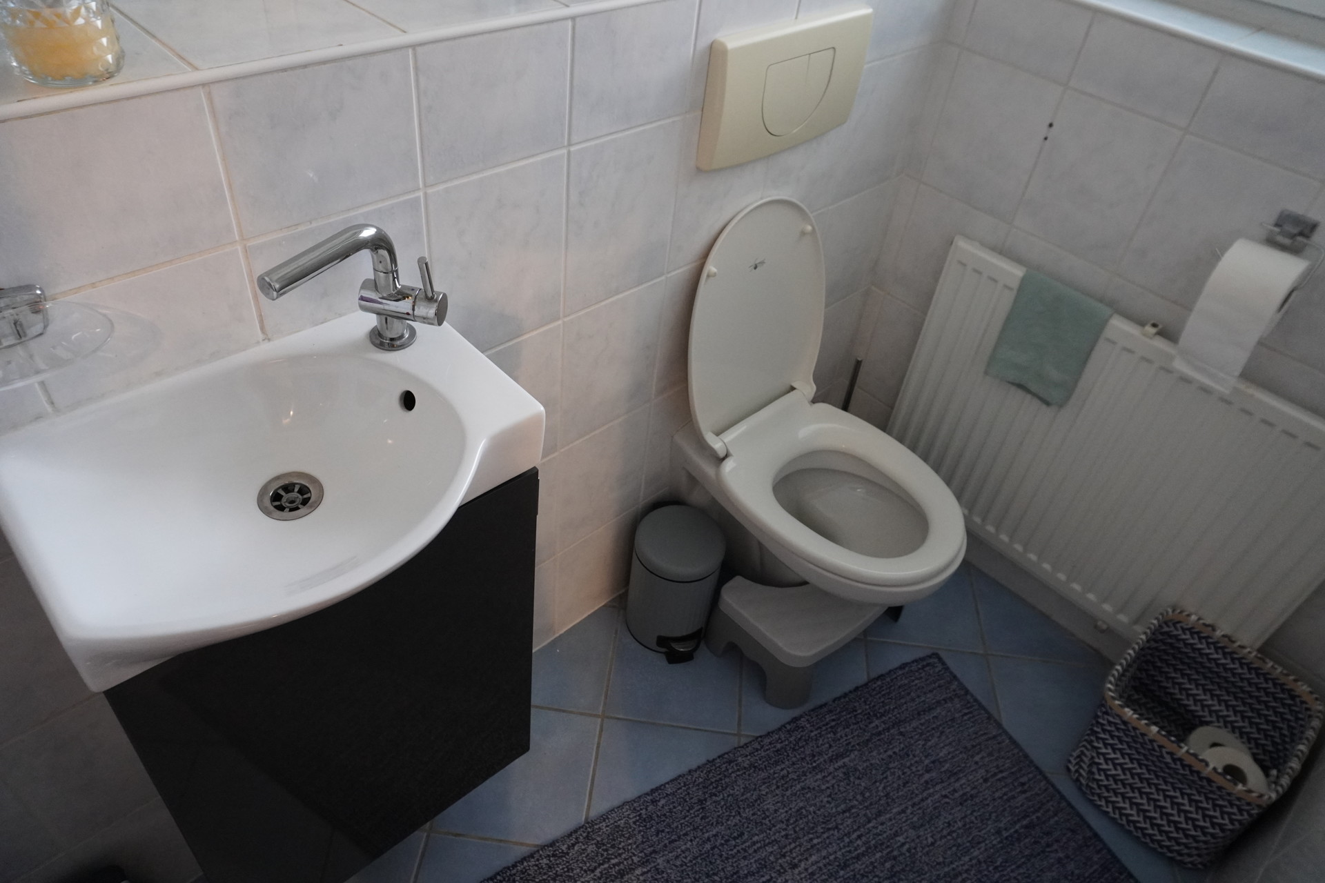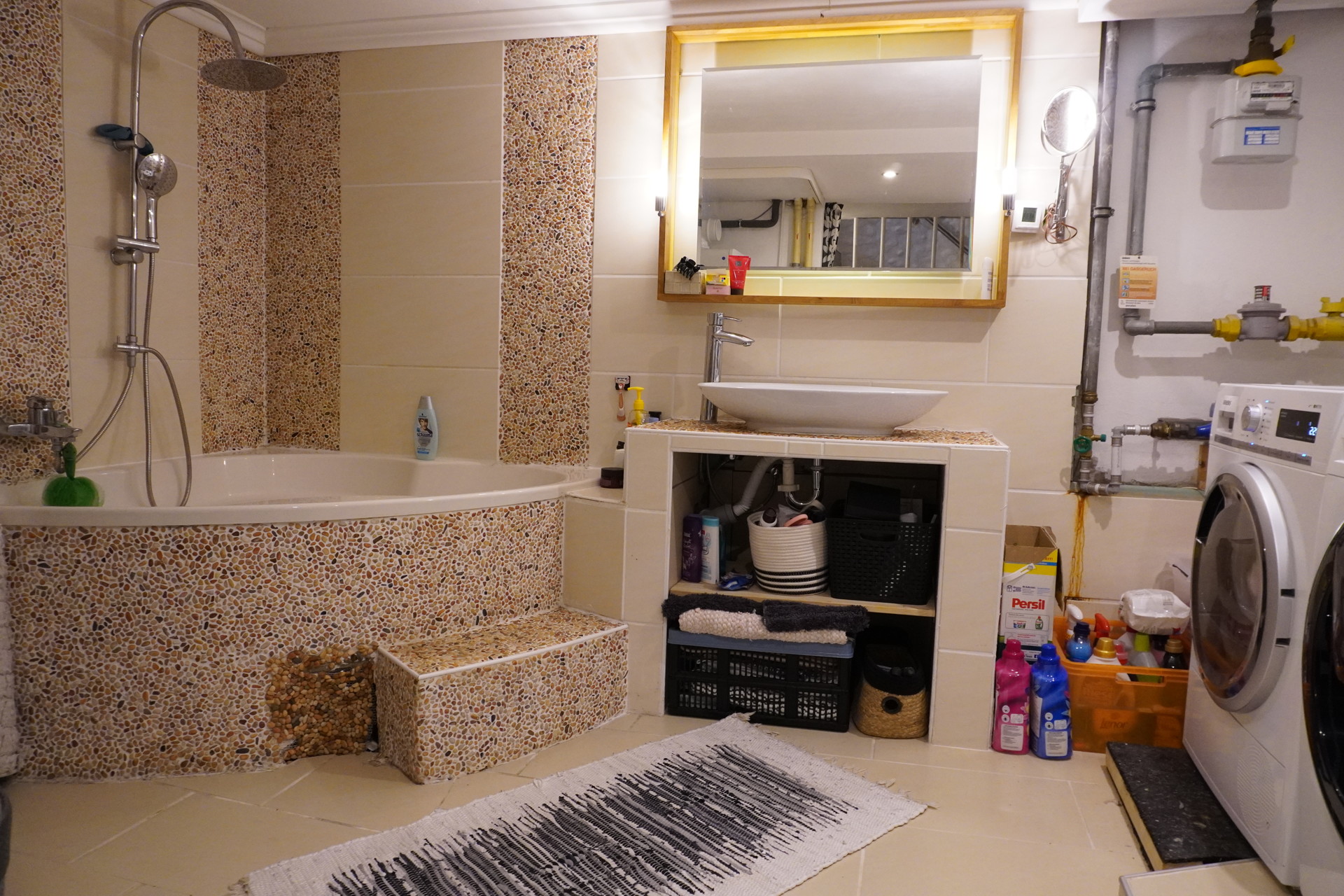 Das Badezimmer ist ein Ort, der Design und Zweckmäßigkeit perfekt miteinander verbindet. Hochwertige Materialien, moderne Armaturen und eine durchdachte Gestaltung schaffen eine einladende Atmosphäre. Mit einer Kombination aus einer geräumigen Dusche und einer entspannenden Badewanne bietet es sowohl Praktikabilität als auch Luxus – ob ein schneller Start in den Morgen oder ein erholsames Bad am Abend.