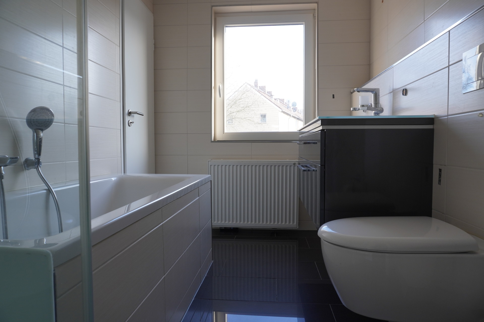Das gut geschnittene Schlafzimmer, ideal als Elternschlafzimmer geeignet. Modernes und helles Badezimmer mit Badewanne, Dusche, WC und Waschtisch.