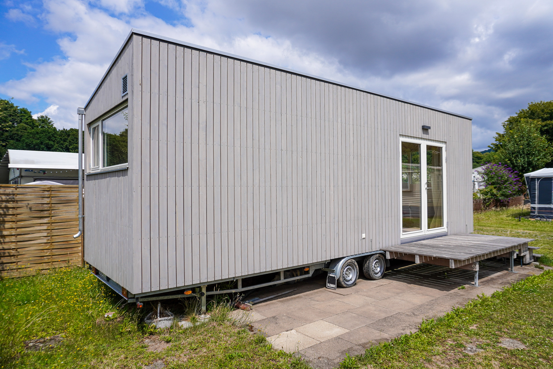 Das Tinyhaus steht auf einem stabilen, zugelassenen Fahrgestell und misst 8,40 m in der Länge und 2,55 m in der Breite. Die helle Holzfassade fügt sich harmonisch in die Umgebung ein, während bodentiefe Türen und große Fensterflächen für Licht, Luft und Leichtigkeit sorgen. Der gesamte Innenausbau ist geprägt von natürlichen Materialien, allen voran Massivholzoberflächen, die ein warmes und gesundes Raumklima schaffen. Besonders hervorzuheben ist die durchdachte Raumaufteilung: Getrennte Wohn-, Schlaf- und Funktionsbereiche ermöglichen echten Wohnkomfort trotz kompakter Fläche.