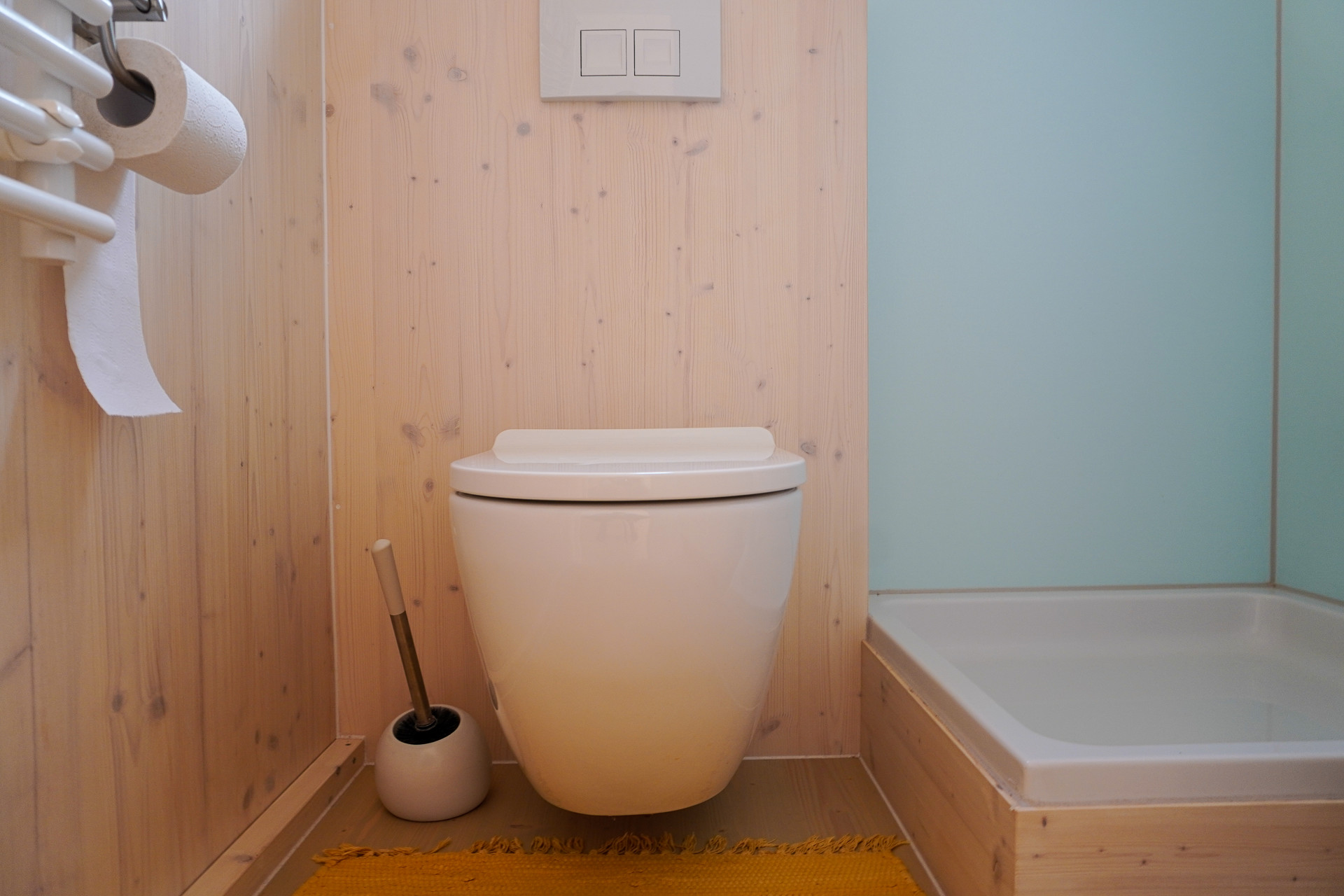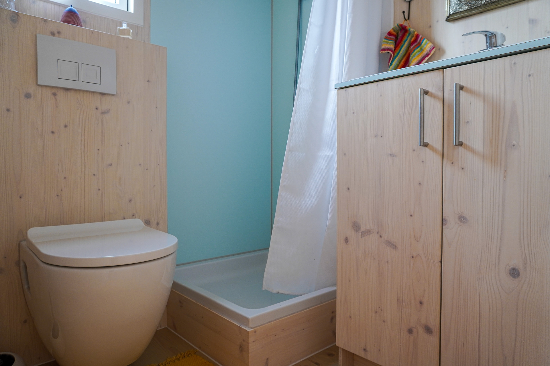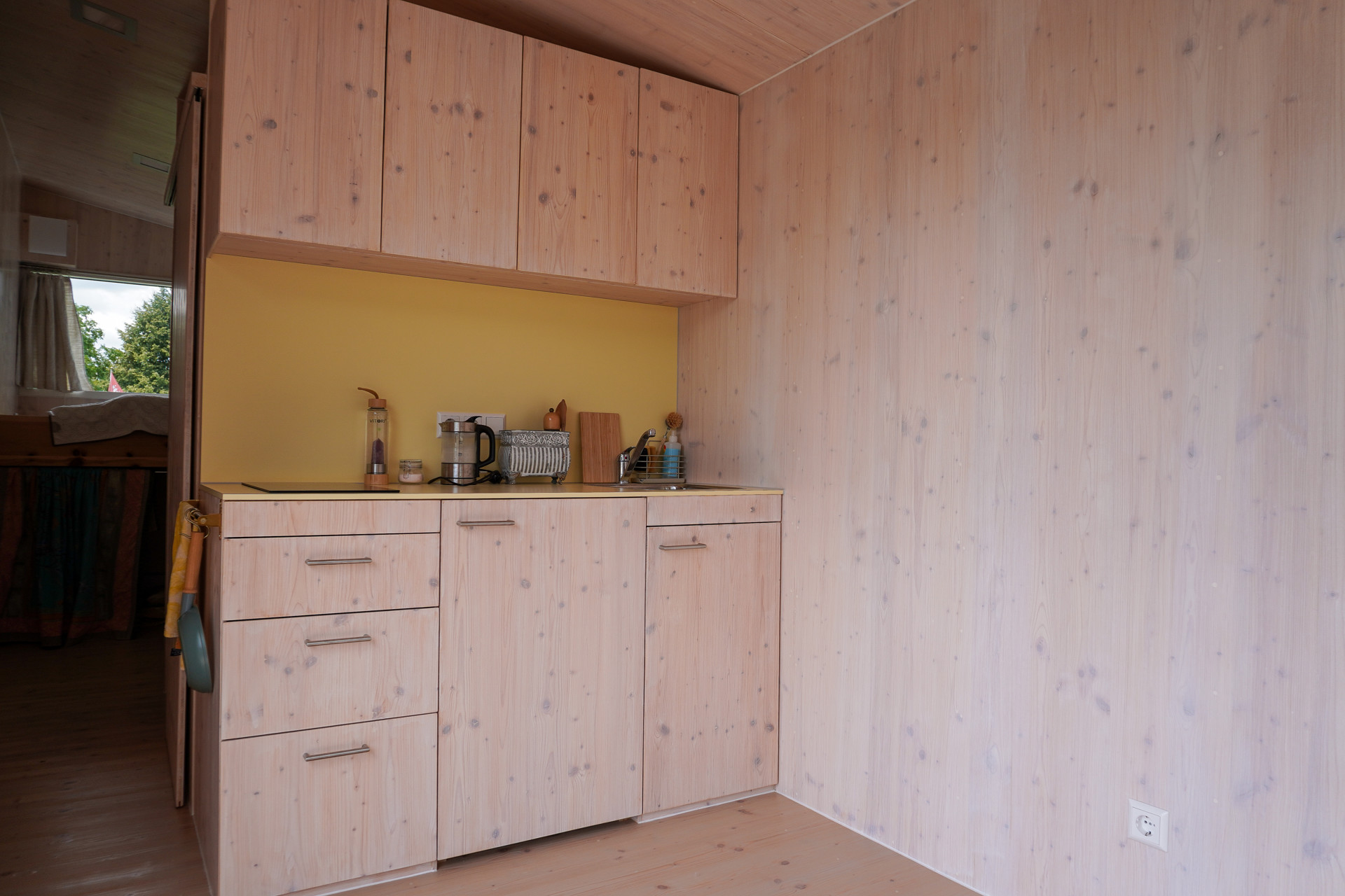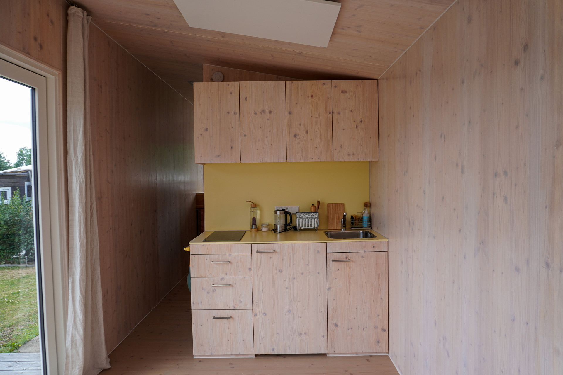 Die Ausstattung dieses Tinyhauses überzeugt durch ein perfekt abgestimmtes Zusammenspiel aus Qualität, Funktionalität und Nachhaltigkeit. Bereits beim Betreten fällt der Einsatz hochwertiger Naturmaterialien ins Auge. Sichtbare Holzoberflächen, lackierte Kieferntüren und handverlesene Details schaffen eine Atmosphäre der Ruhe und Behaglichkeit. Das Raumklima ist dank Holzrahmenbau und ökologischer Dämmstoffe sehr angenehm.