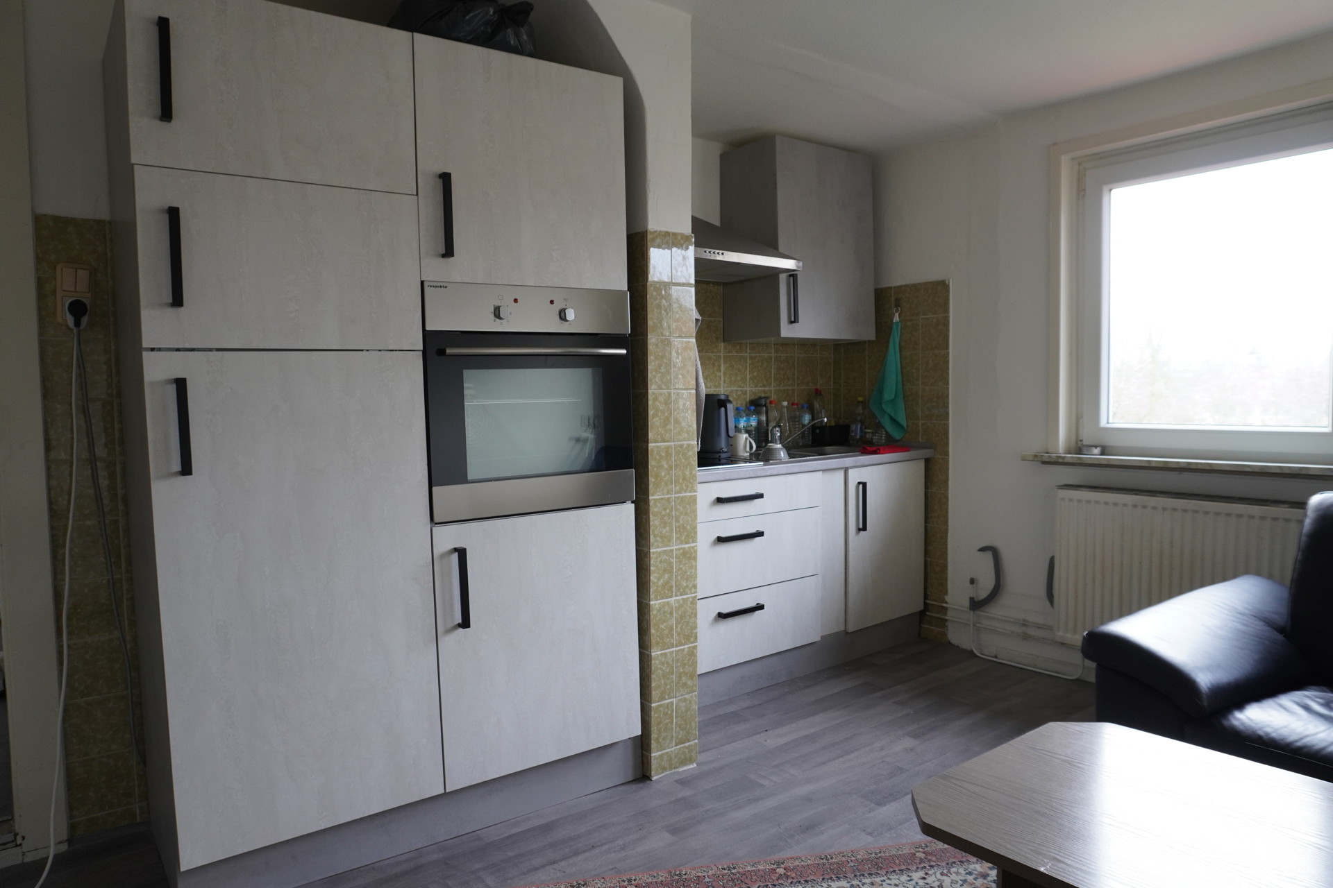 Der Grundriss ist effizient konzipiert: Alle Räume sind direkt vom Flur aus zugänglich – das sorgt für Privatsphäre und ein angenehmes Wohngefühl. Das helle Wohnzimmer mit zwei großen Fenstern bildet das Herzstück der Wohnung und überzeugt mit seinem klaren Zuschnitt. Angrenzend befindet sich die moderne Einbauküche in Holzoptik, die über einen Backofen, Herd, Dunstabzug und großzügige Stauflächen verfügt – ein Platz, der Kochen und Geselligkeit mühelos vereint.