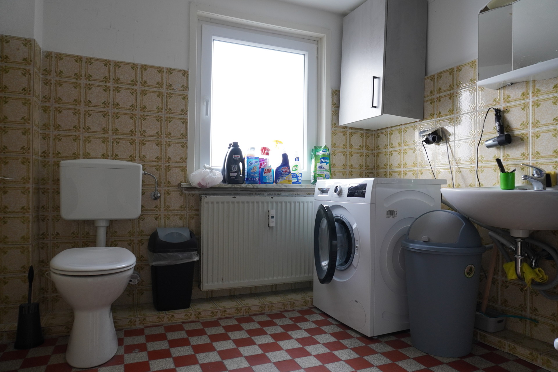 Das Tageslichtbad überzeugt mit authentischem Retro-Charme: Ausgestattet mit Dusche, WC, Waschbecken, Waschmaschinenanschluss sowie Fenster für natürliche Belüftung, erfüllt es sämtliche funktionale Anforderungen.